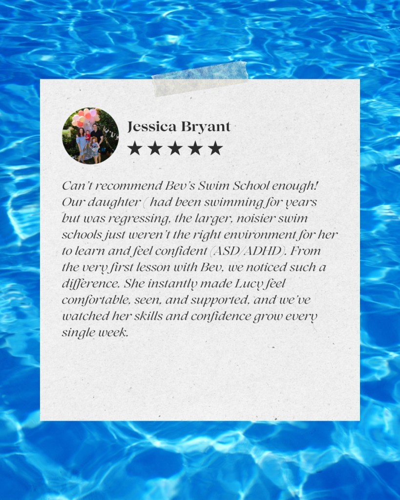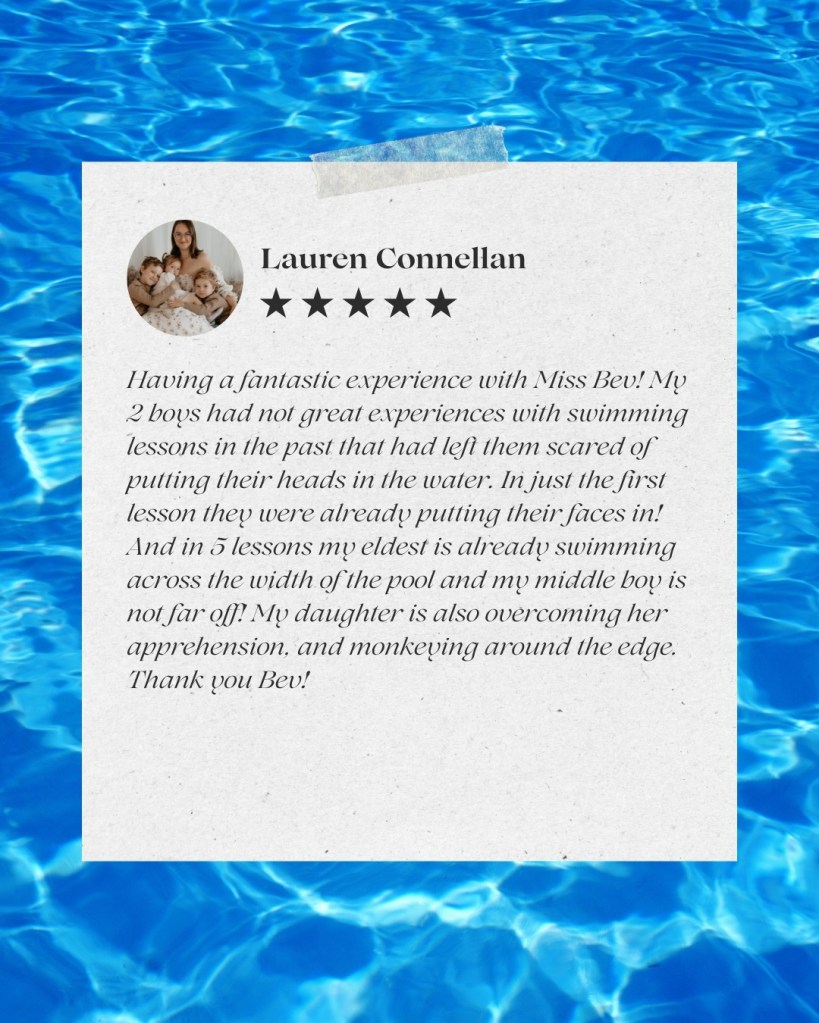 Lessons are available by booking only via messaging the dedicated Facebook Page Bev’s Wiggle N Swim.